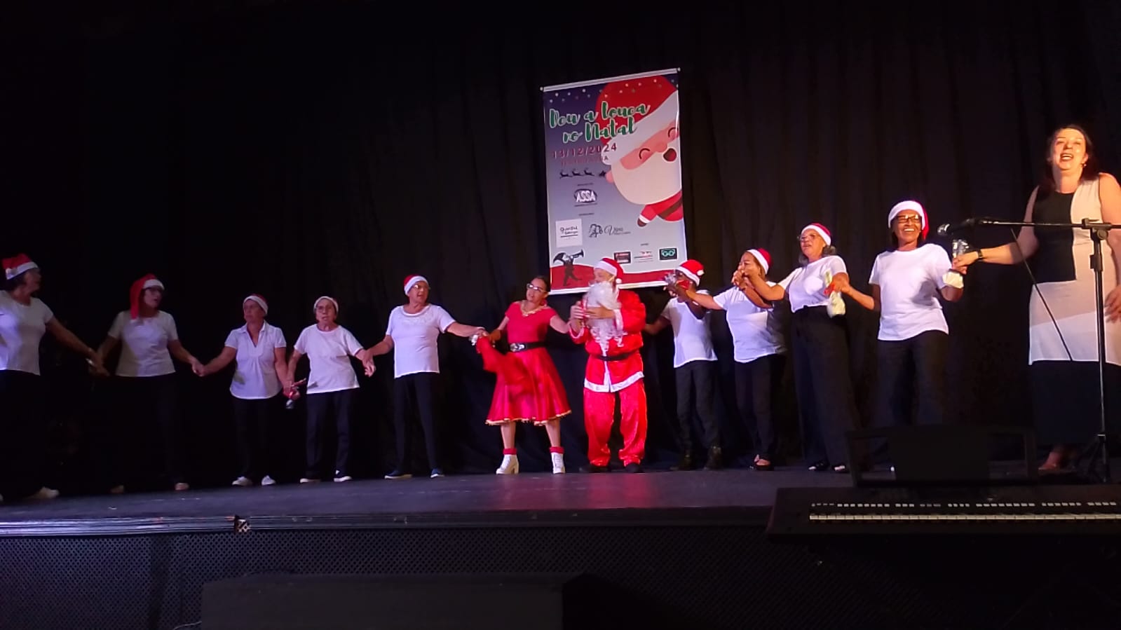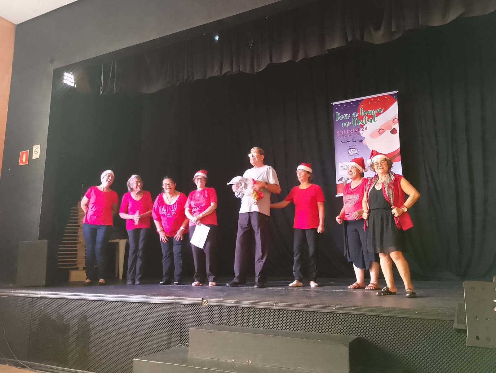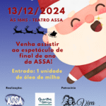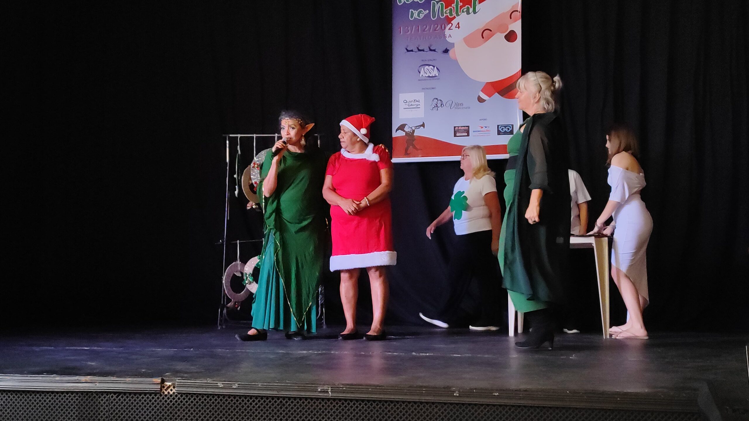 No dia 13 de dezembro de 2024, no Teatro ASSA, aconteceu o espetáculo da ASSA com o tema: “Deu a Louca no Natal”. O Espetáculo foi um conto de Natal com várias apresentações realizadas pelos professores e voluntários que dão aulas para nossos idosos. Contamos com o patrocínio e apoio dos nossos parceiros: O Quintal da Granja, Viva Marcenaria, A lojinha, Divino Balões e Óticas Godoy.