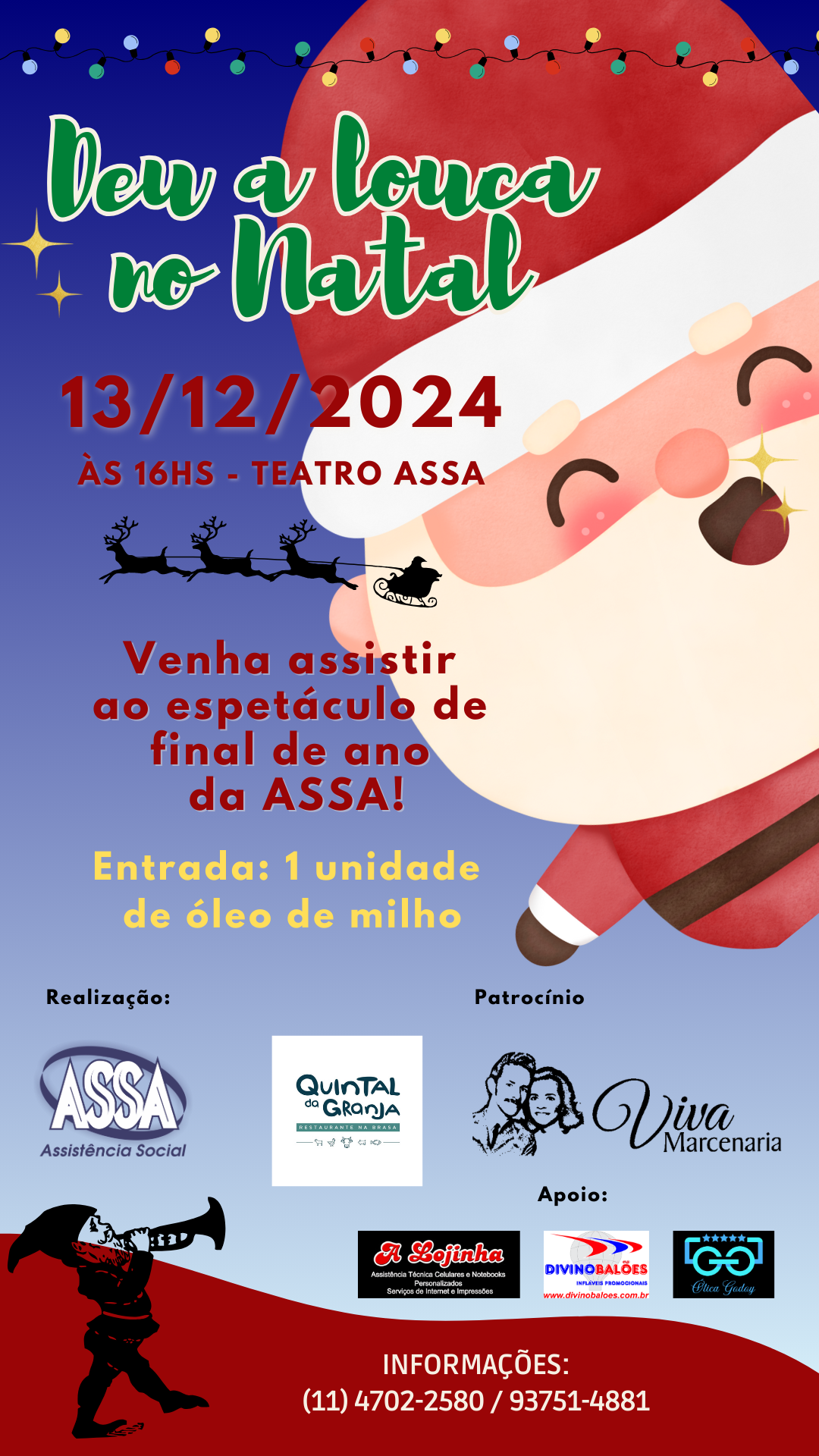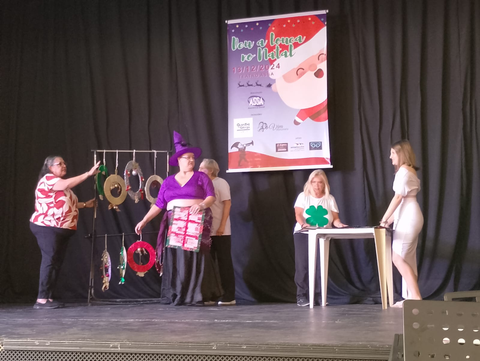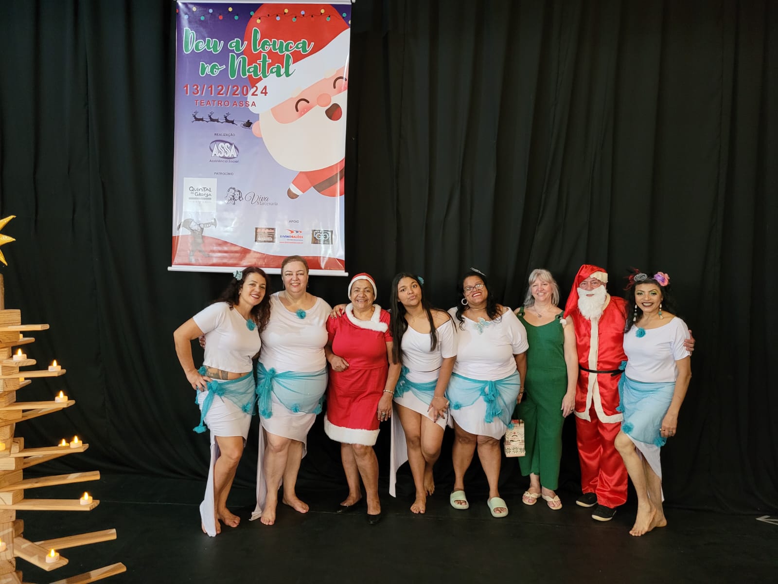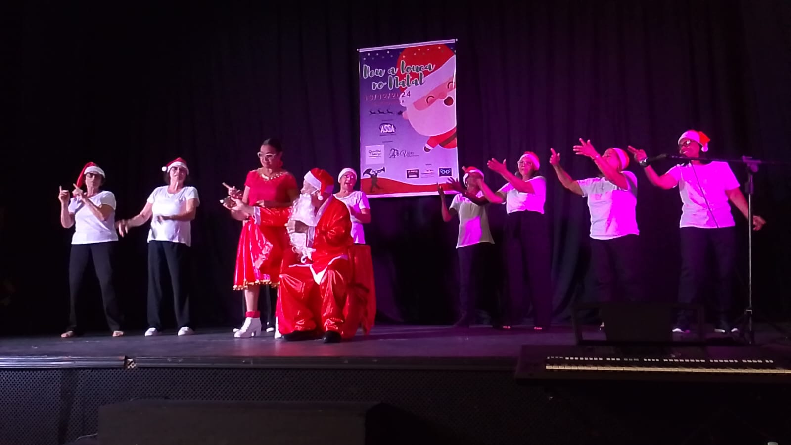 No dia 13 de dezembro de 2024, no Teatro ASSA, aconteceu o espetáculo da ASSA com o tema: “Deu a Louca no Natal”. O Espetáculo foi um conto de Natal com várias apresentações realizadas pelos professores e voluntários que dão aulas para nossos idosos. Contamos com o patrocínio e apoio dos nossos parceiros: O Quintal da Granja, Viva Marcenaria, A lojinha, Divino Balões e Óticas Godoy.